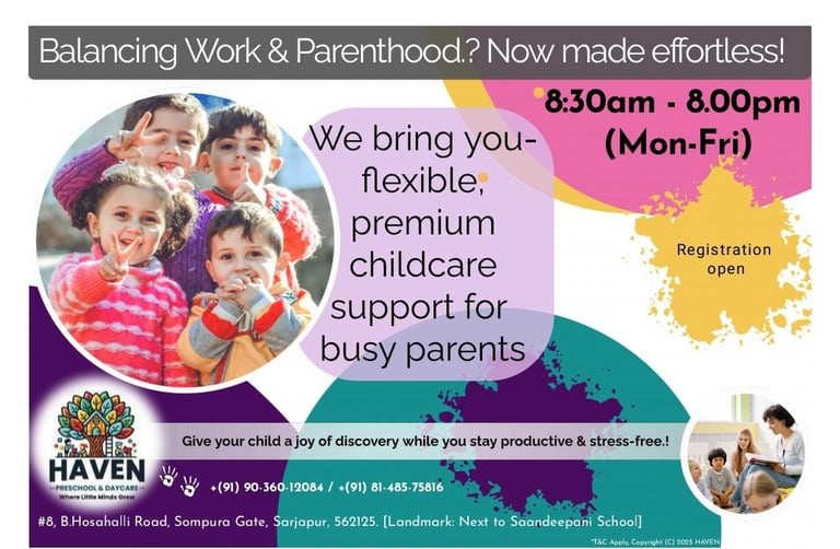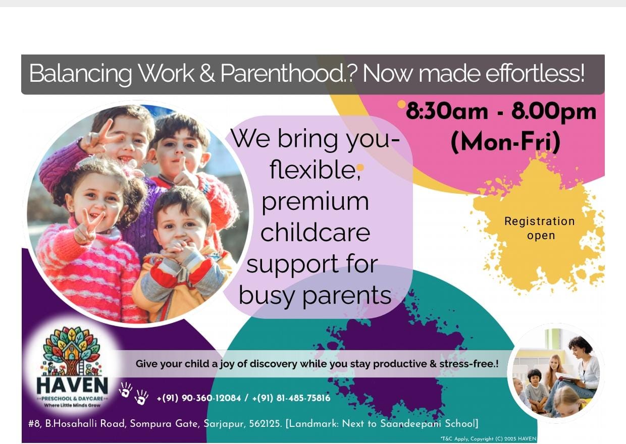 We are working towards providing safety and comfort to all our kids. At Haven you do not find our premise over-crowded - which makes attention to kids easy for our Educators. These principles are kept in mind, in our actions too - we are starting to renovate the premise and parents could see changes in the quality and class room atmosphere soon. We welcome constructive feedback/suggestions.